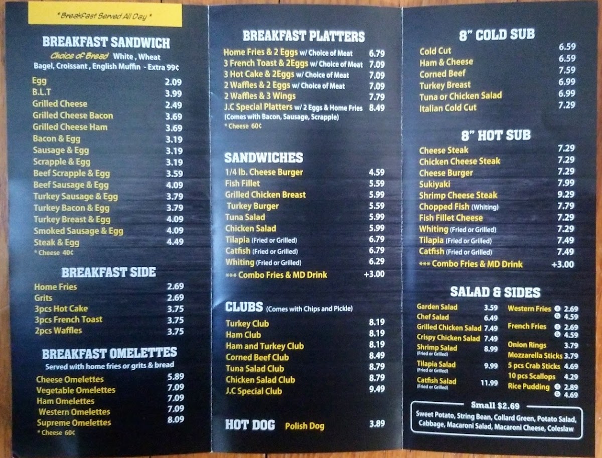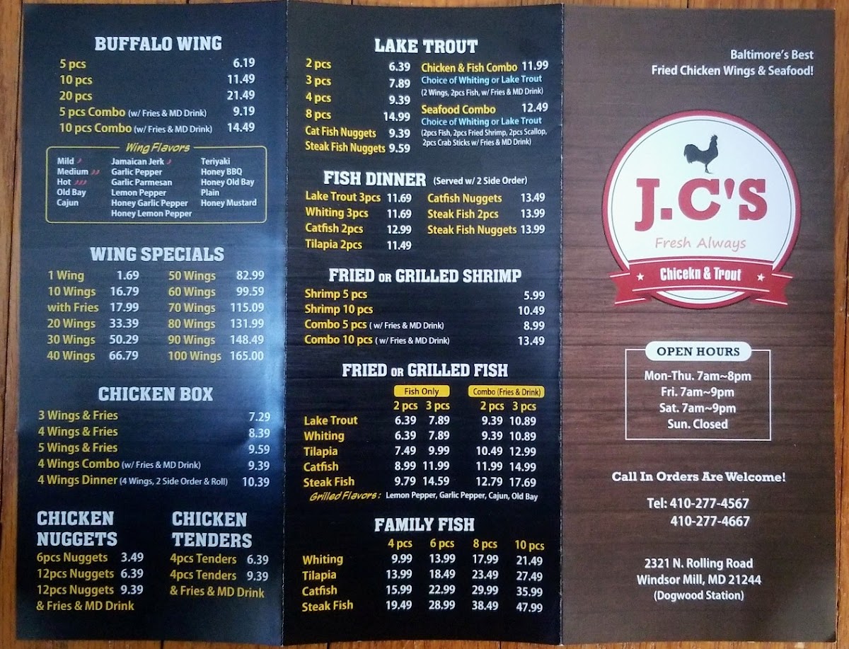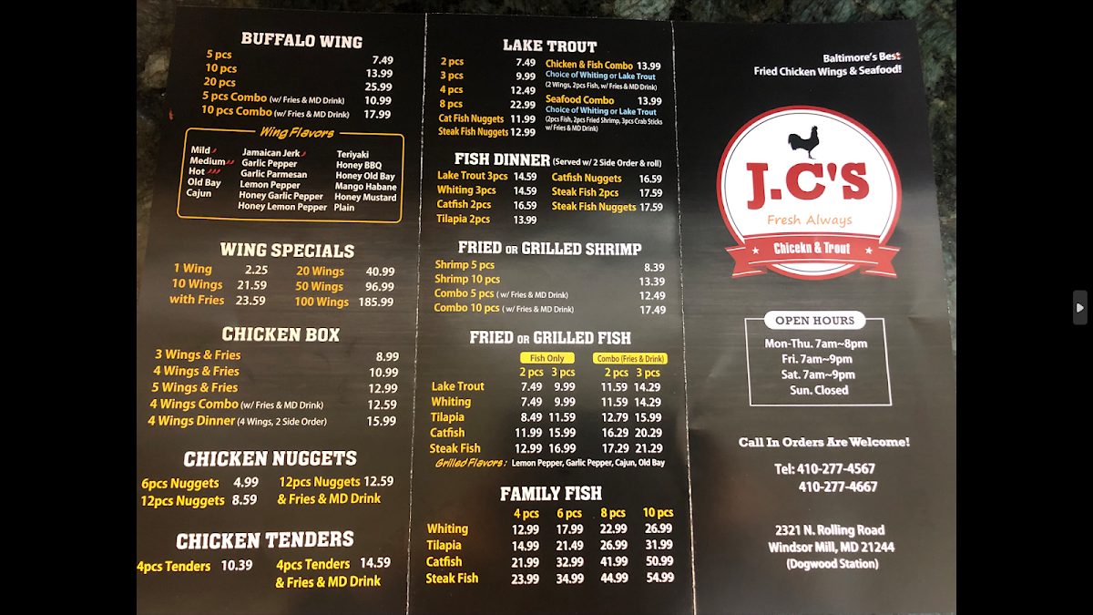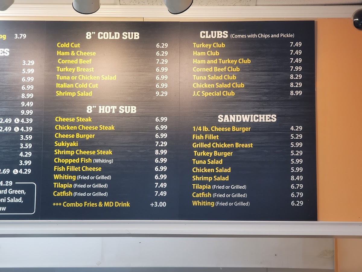 The menu's variety also makes it easy to find something that suits different tastes and appetites. From grilled options like whiting and tilapia to crispy fried shrimp, the food invites a laid-back experience you can rely on. Accompanying sides and comforting drinks complete the meal—making JC's a place where casual moments are met with familiar tastes and straightforward satisfaction.